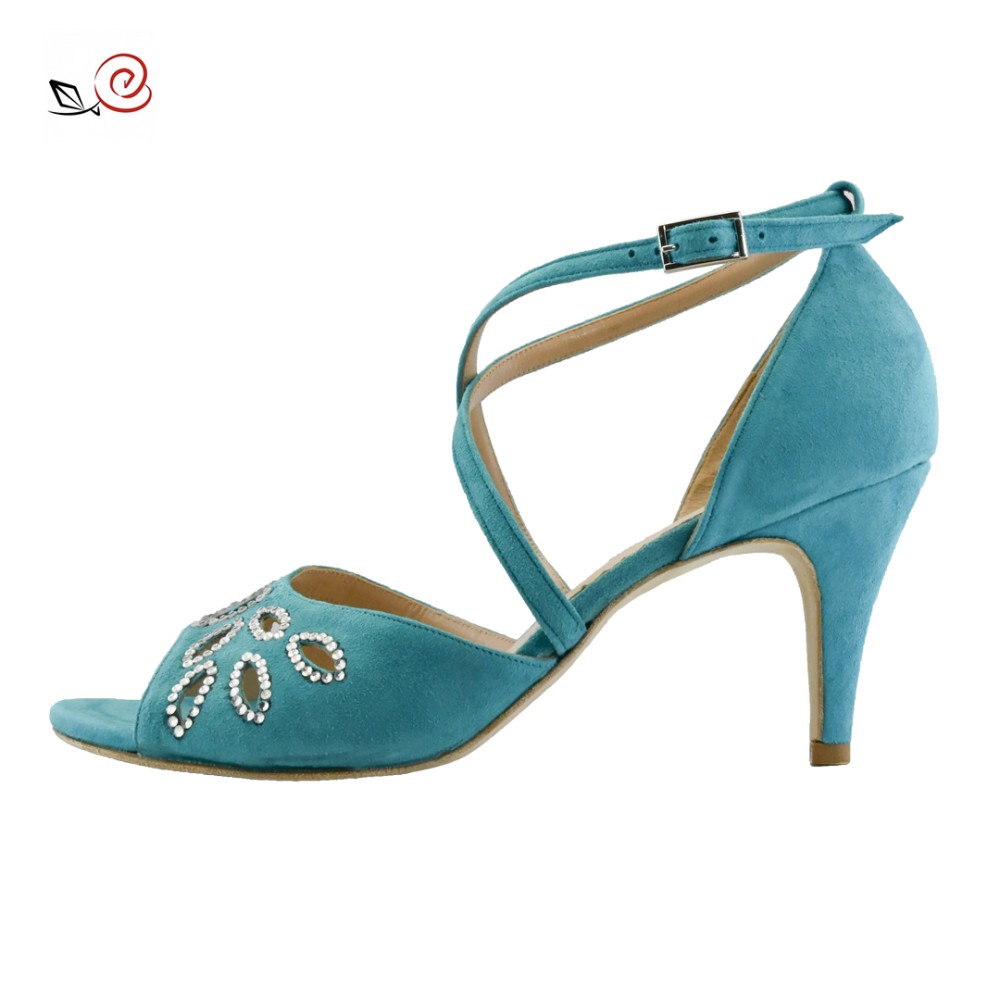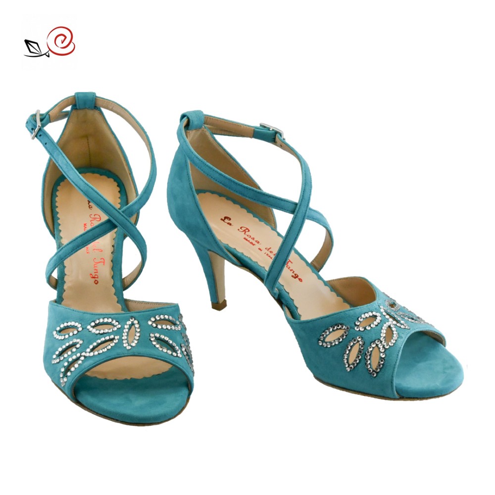 Marke La rosa del tango, Fiorella-Modell aus türkises Wildleder mit Intarsie und Strasssteinen auf dem Vorderriemen. Hoher gekreuzter Riemen. Offene Zehenpartie und geschlossene Ferse.