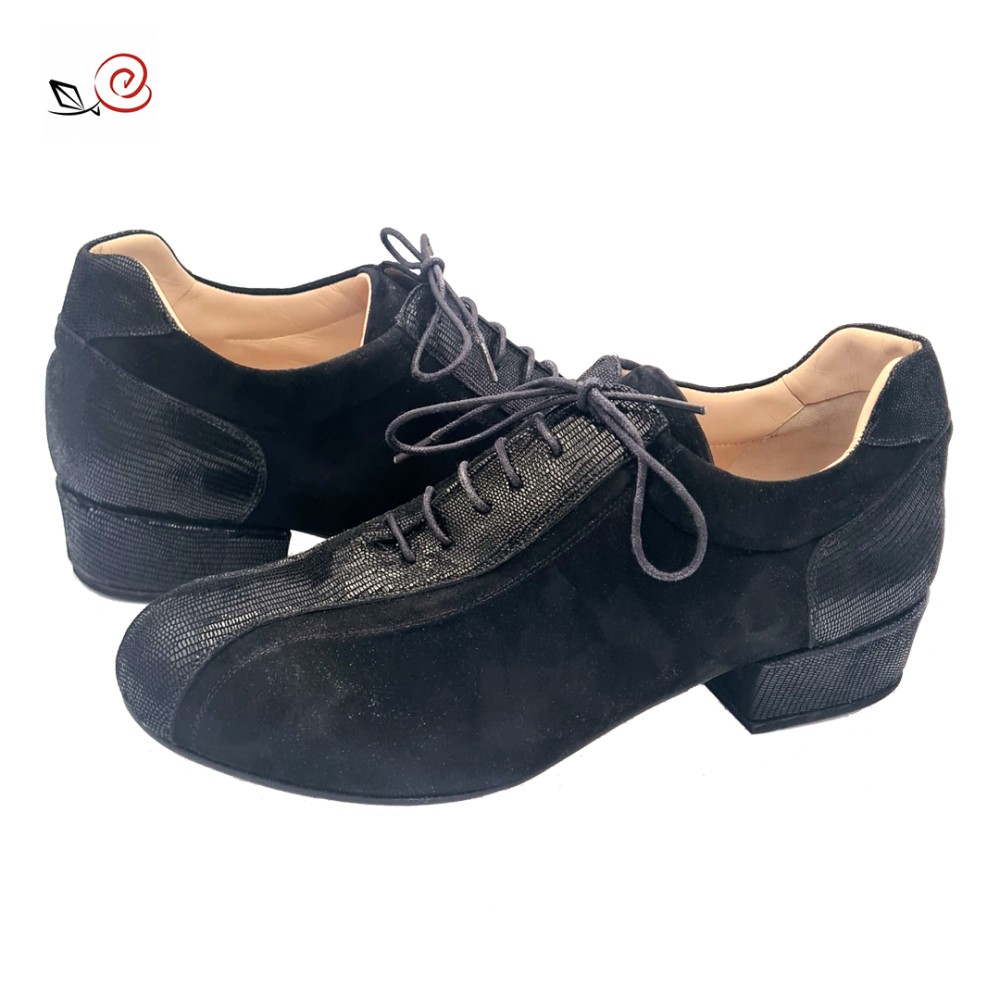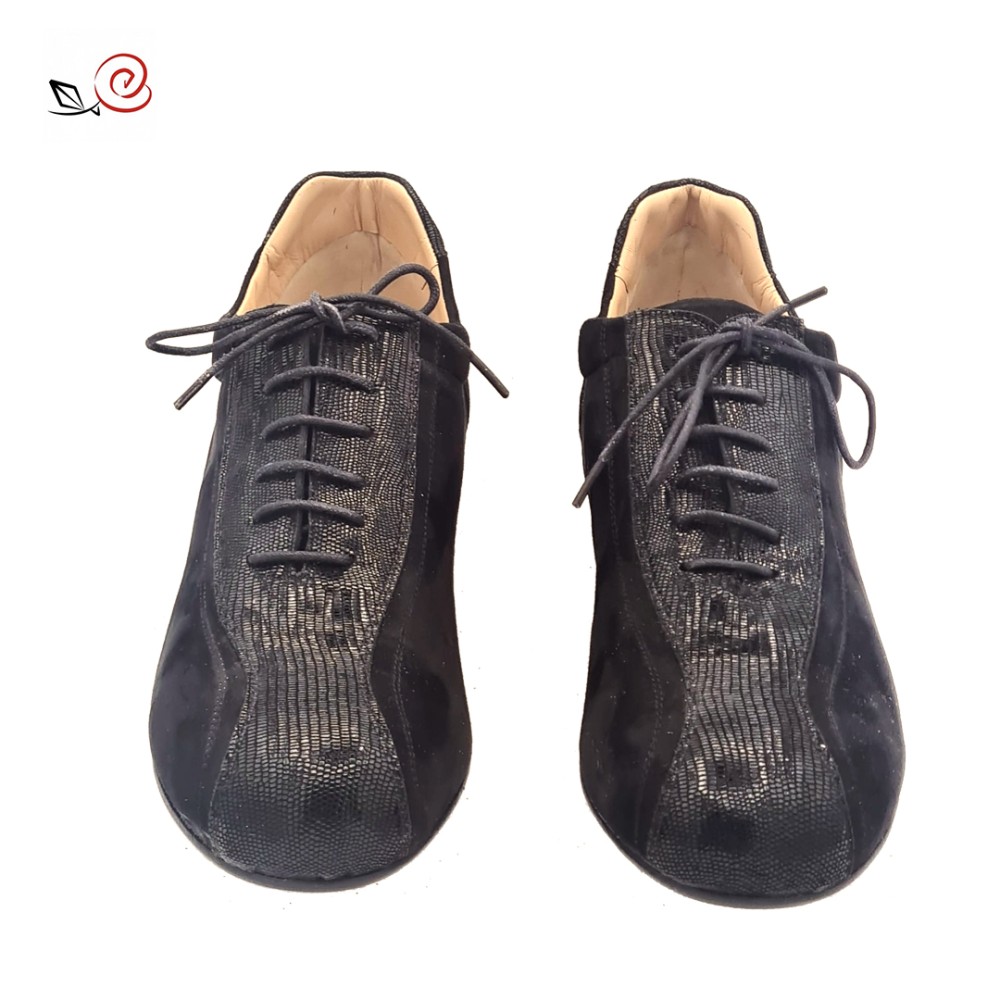 Marke: La rosa del tango, Modell-Stefano aus Minitejus-Print auf schwarzem Wildleder und schwarzem Wildleder. Abgerundete Zehenpartie. Exklusive Dämpfung und Beutelkonstruktion.