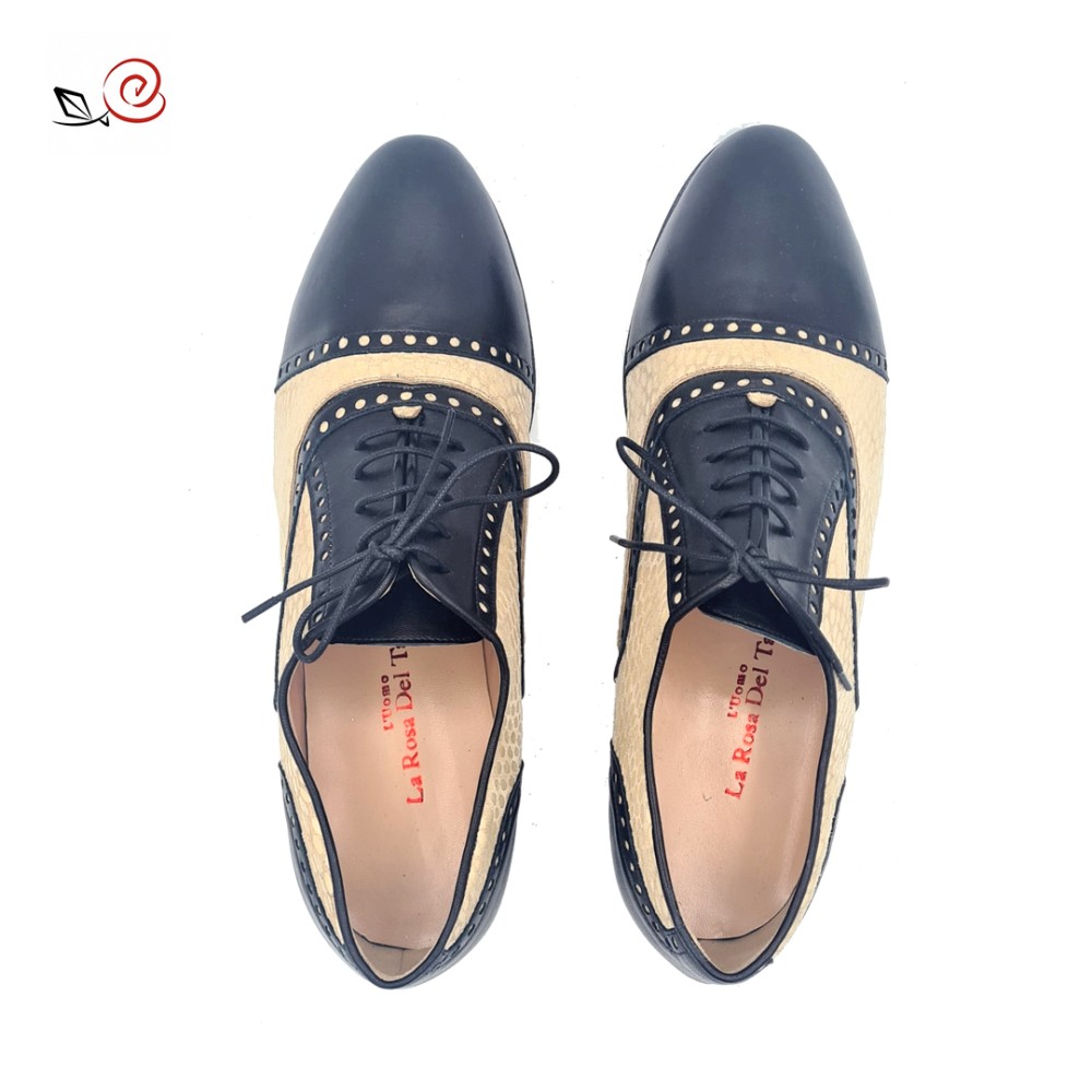 Marke: La rosa del tango, Modell-Richard aus schwarzes Nappaleder und sandfarbener Pythonprint. Wellenförmige Zehenpartie.