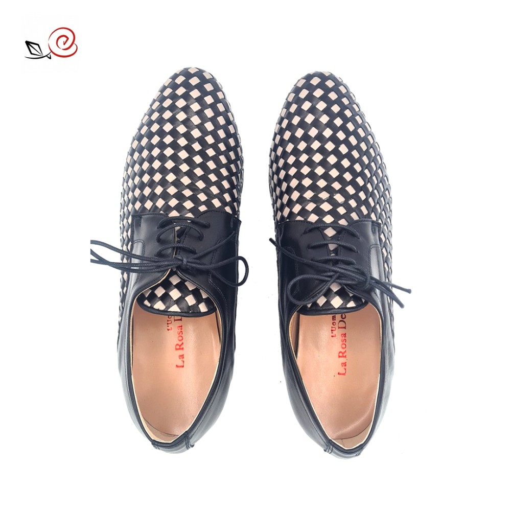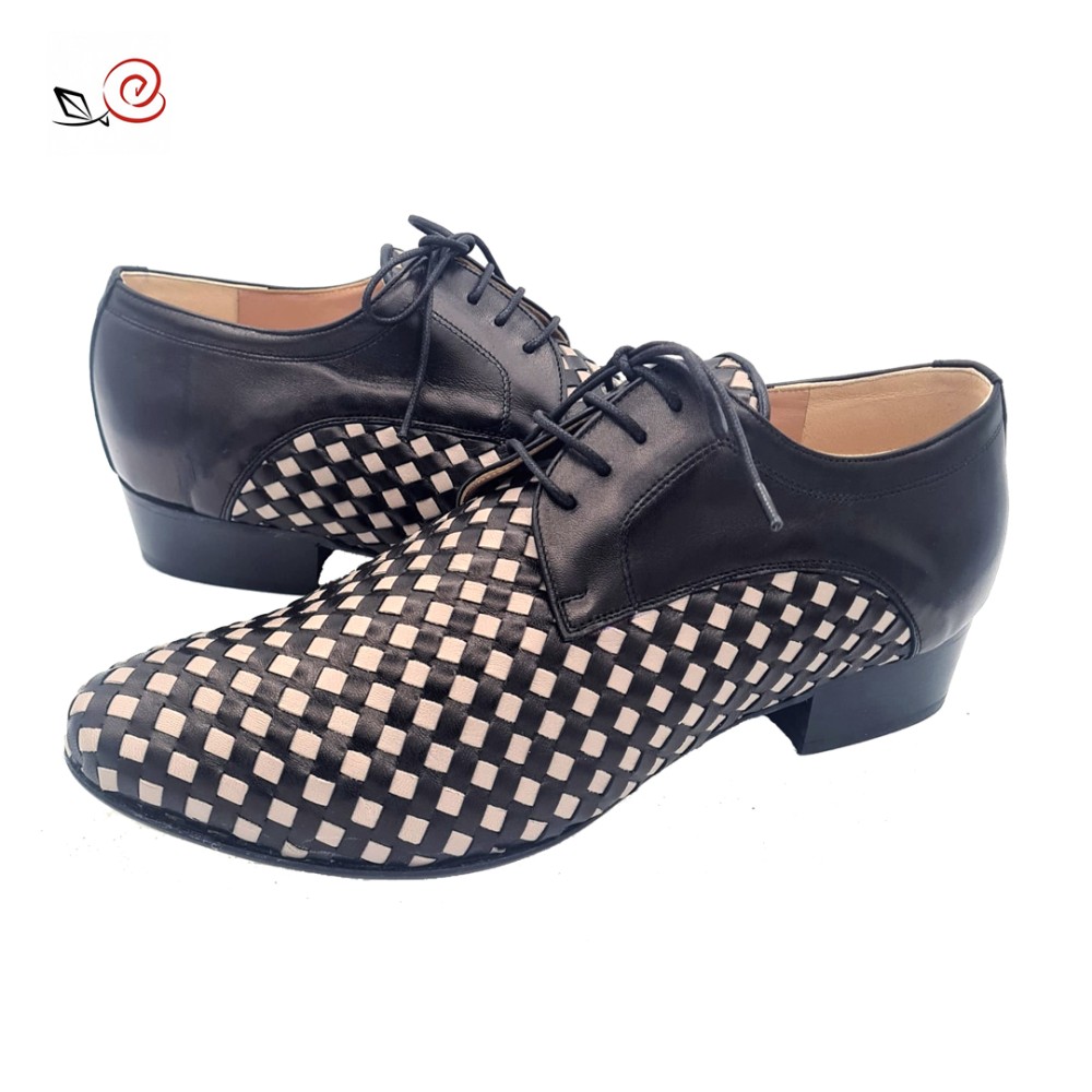La rosa del tango brand, Rafael model in black nappa leather and beige nappa leather intertwined. Swallow-tailed toe.