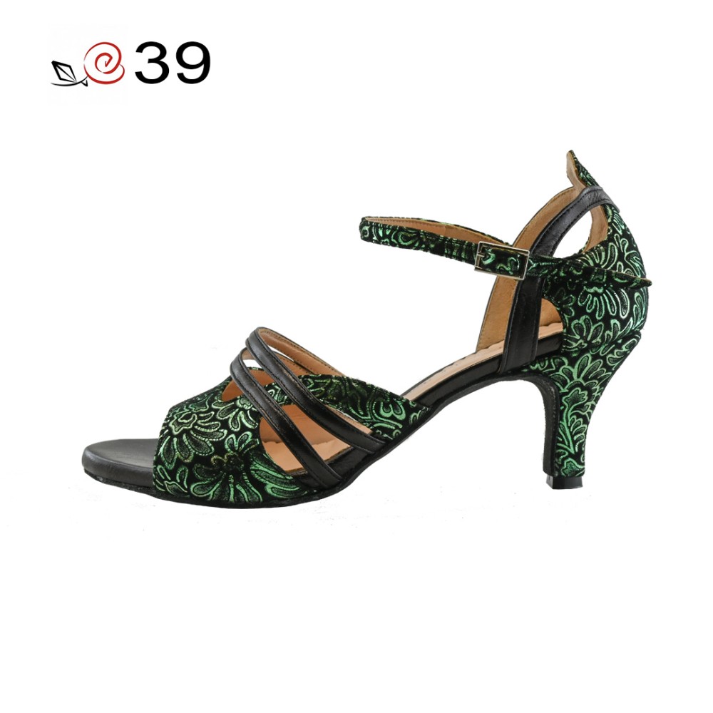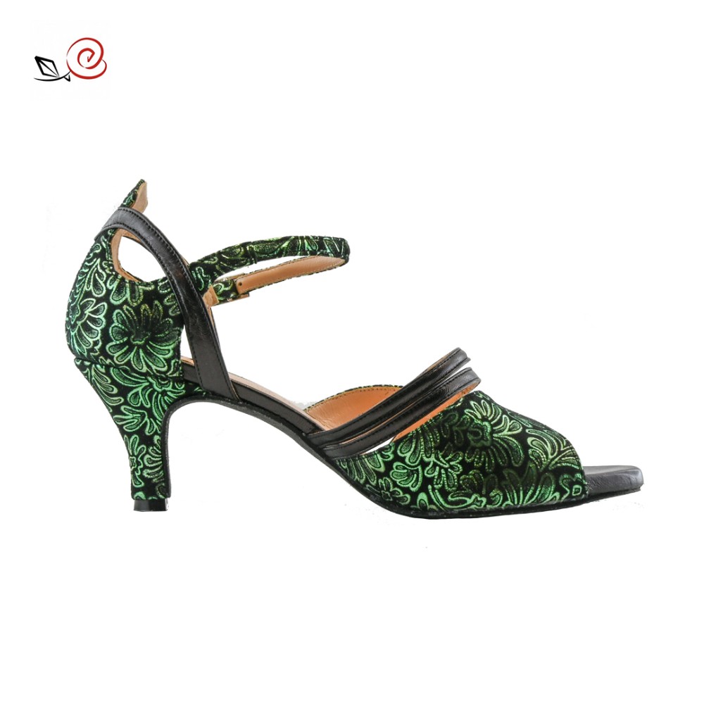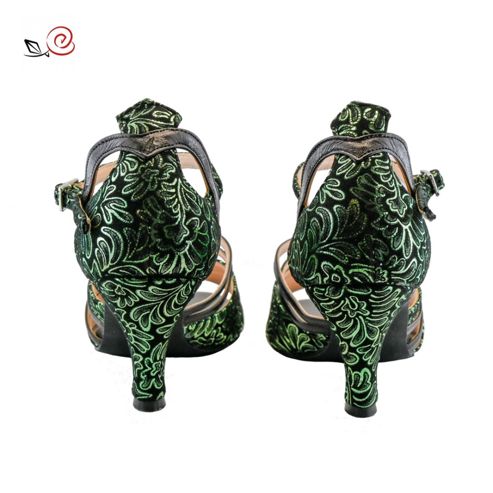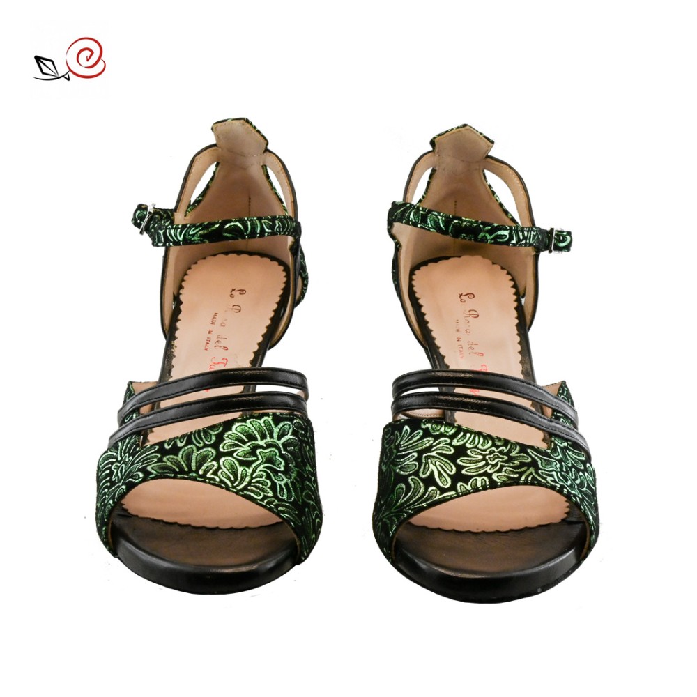 La rosa del tango brand, Genny model in green printed fabric and black leather.