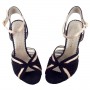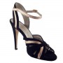 Marchio La rosa del tango, modello Giulia in camoscio nero e tessuto glitter oro con intreccio a farfalla sulla fascia anteriore. Punta e tallone aperti.