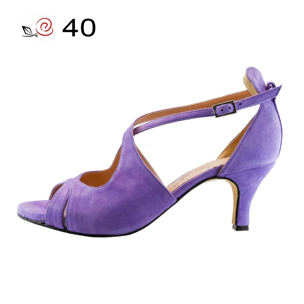 La rosa del tango, modello Diva in camoscio lilla. Punta aperta e tallone chiuso. Cinturino alto incrociato sul dorso del piede.